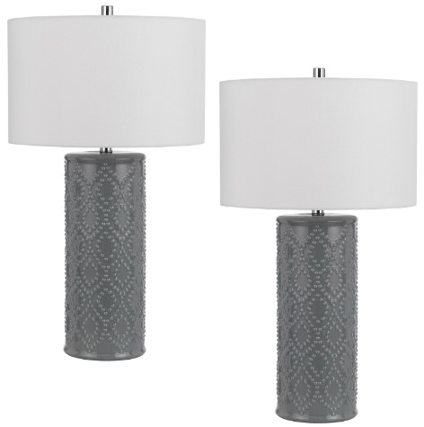 Add an elegant touch to your living room space, bedside or office with this eye-catching table lamp set. Shown in a slate grey/white finish, and features a studded patten on base. This casual yet elegant lamp set is a stylish way to refresh your rooms look.Read More