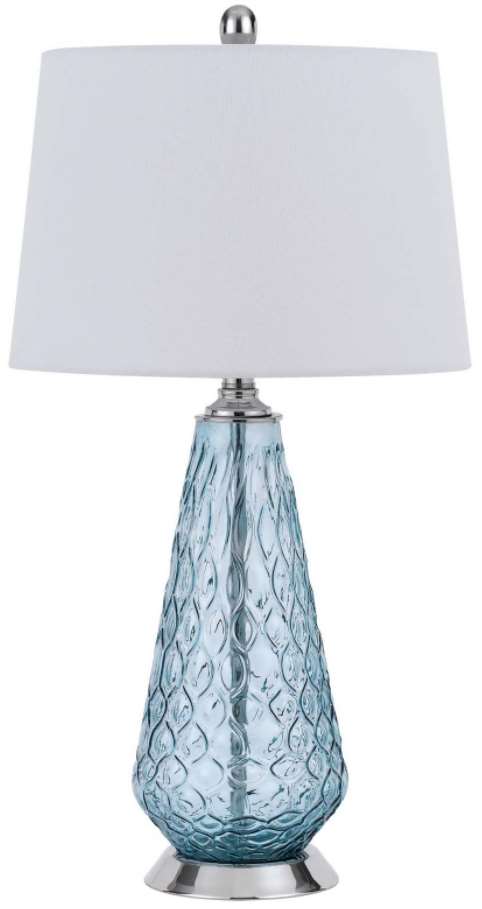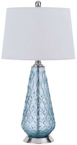 Add a touch of color to any room in your house with this hand-blown art glass table lamp. It features a tear drop pattern in Aqua Blue finish with hardback taper drum fabric shade.Read More