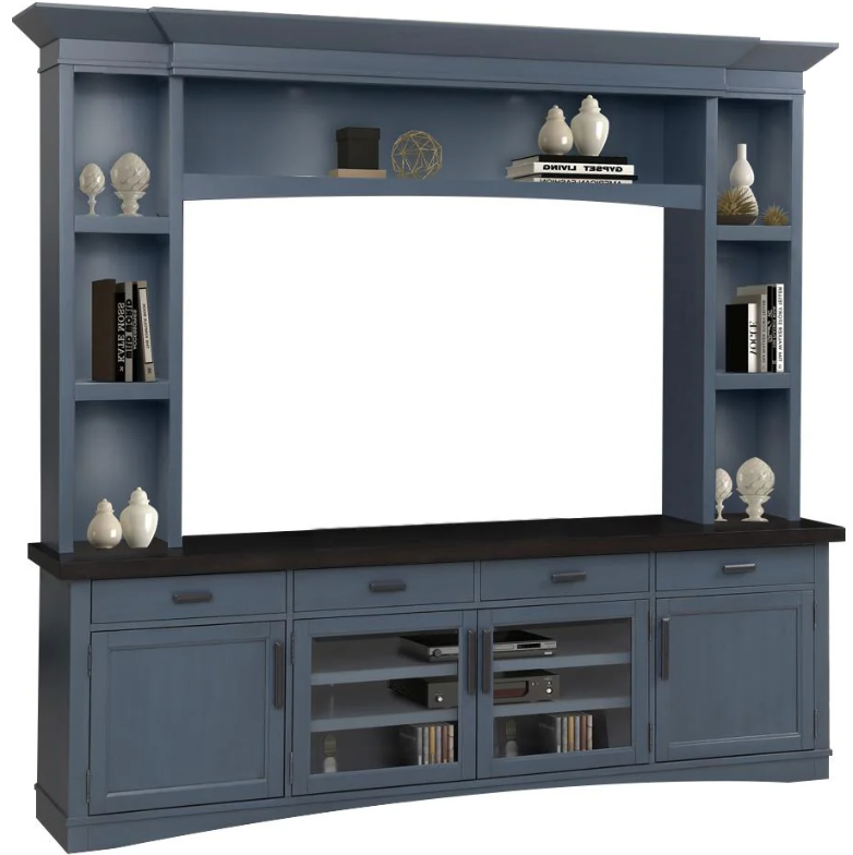 Surround your television and components in classic style with this 92-inch TV Console with Hutch. Simple yet elegant, its classic silhouette is finished in a denim blue with a contrasting sable wood finish.Read More